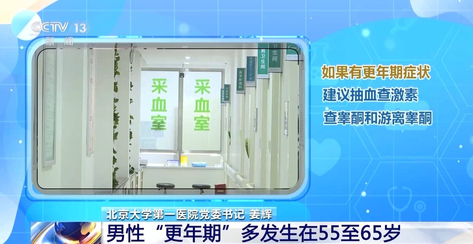北京大学第一医院党委书记 姜辉:我们如果有更年期症状,医生会建议你抽血查激素,特别查你的睾酮和游离睾酮,如果睾酮低了,正常是11.5以上nmol/L,然后如果低于8nmol/L,那就一定要用药补充了,补充一些雄激素,包括严重的可以打针等,经过一段治疗,帮助男性过了这一段时期,他也就好了。